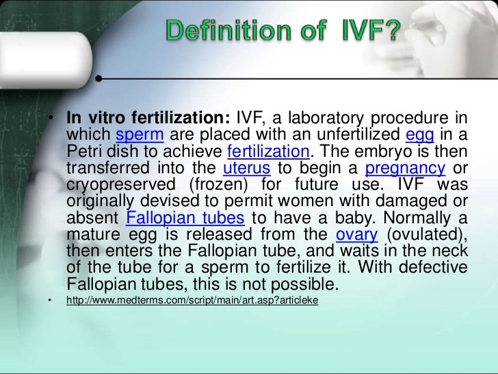 ɪn ˌviːtrəʊ fɜːtɪlaɪˈzeɪʃ ə n abbreviation IVF a treatment for a woman who cannot become pregnant naturally in which an egg is fertilized outside her body and the resulting embryo is put into her womb to develop into a baby SMART Vocabulary. In fact techniques of in vitro fertilization are accepted based on the presupposition that the individual embryo is not deserving of full respect in the presence of the competing desire for. In vitro fertilization is a procedure where the joining of egg and sperm takes place outside of the womans body.